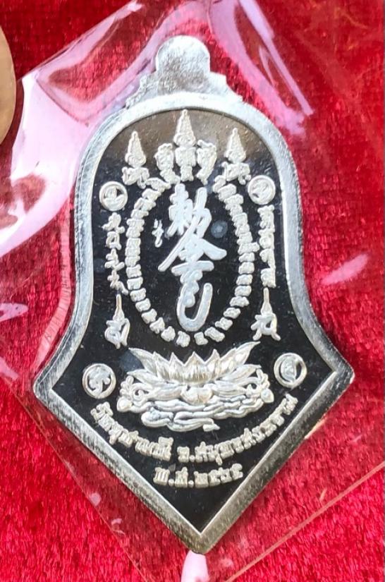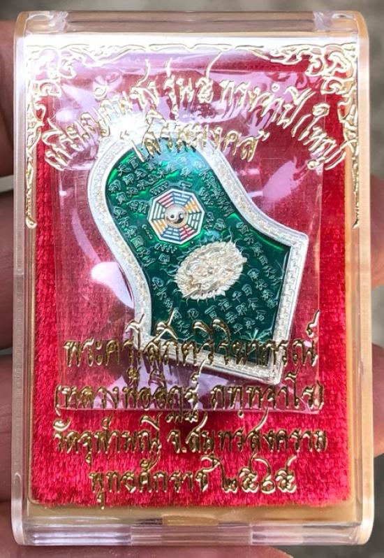 เหรียญกันชง ทรงจำปี หลวงพ่ออิฏฐ์ วัดจุฬามณี จ.สมุทรสงคราม เนื้อเงินพิมพ์ใหญ่ ลงยาสีเขียว ซีลเดิมกล่องเดิม