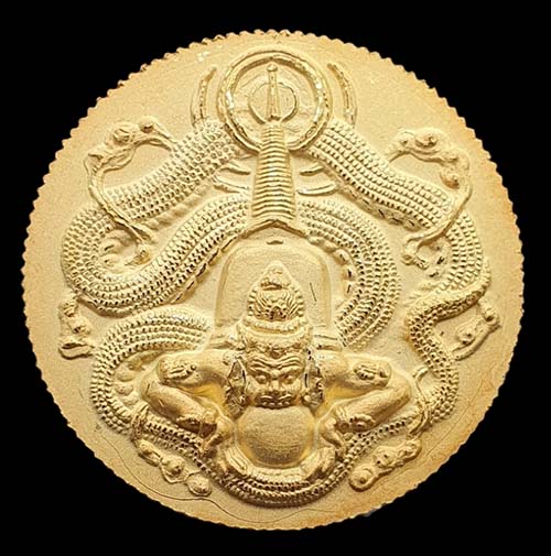 เหรียญองค์พ่อจตุคาม รุ่น รวยไม่เลิก เหรียญแจกศูนย์จอง ชุบทองพ่นทราย ลงยาแดง ขนาด 3.2 ซม. ไม่มีกล่อง