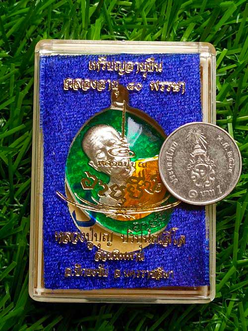 " วัดใจ เคาะเดียวแดง " เหรียญอายุยืน ฉลองอายุ 80 พรรษา หลวงปู่บุญ ปริปุนณสีโล วัดปอแดง (สวนนิพพาน) จ.นครราชสีมา ปี 2558 เนื้อเงิน ลงยาสีเขียว หมายเลขตัวเดียว 3 (น้ำหนักโดยประมาณ 14.xx กรัม)