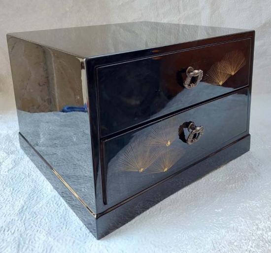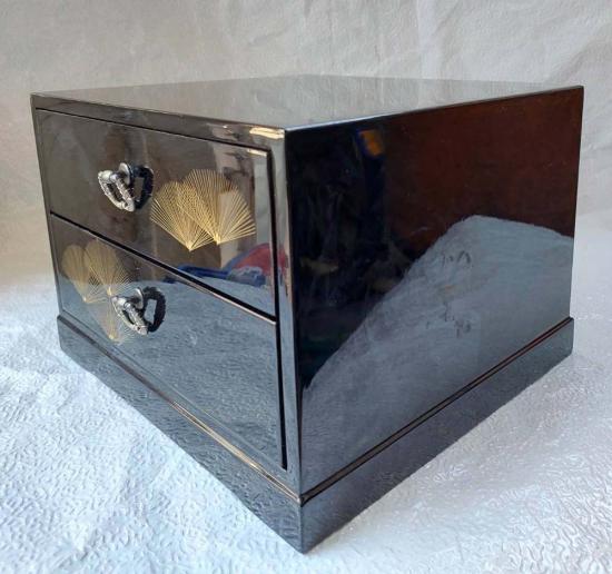 ***กล่องไม้วินเทจญี่ปุ่น งานฝีมือเก่า 2 ลิ้นชัก สามารถวางพระบูชา 5 นิ้วได้ สีดำลายทอง สภาพเก่าเก็บสวย