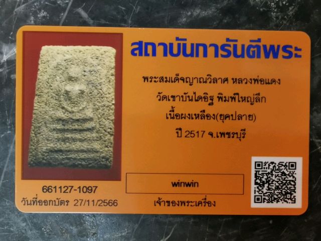 พระสมเด็จญาณวิลาศ หลวงพ่อแดง สัดเขาบันไดอิฐ พิมพ์ใหญ่ลึก หลังยันต์กลับ เนื้อผงเหลือง (ยุคปลาย) ปี2517 จ.เพชรบุรี พร้อมบัตรรับรองครับ รายละเอียด รับประกันตามกฏครับ