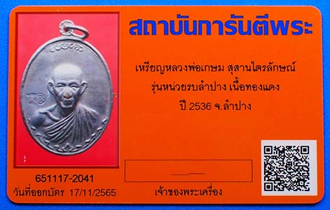 เหรียญหลวงพ่อเกษม สุสานไตรลักษณ์ รุ่นหน่วยรบลำปาง เนื้อทองแดง ปี 2536 จ.ลำปาง พร้อมบัตรรับรองสถาบันการันตีพระ