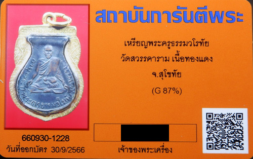 เหรียญพระครูธรรมวโรทัย วัดสวรรคาราม จ.สุโขทัย ปี2500 บัตรรับรอง G-PRA *พระแกะจากเลี่ยมทอง ไม่มีกรอบทองแล้ว..