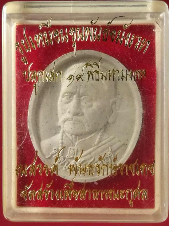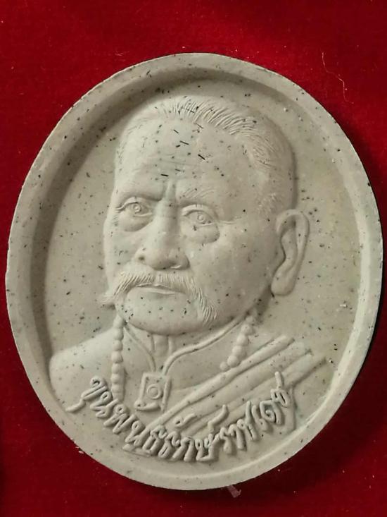 ผงรูปเหมือน ไตรภาคีศรีนคร ท่านขุนพันธ์จอมขมังเวทย์ หลังพิมพ์ลายนิ้วมือ เนื้อผงมหาว่านขาว วัดนางตรา ปี ๒๕๔๘ พร้อมกล่อง