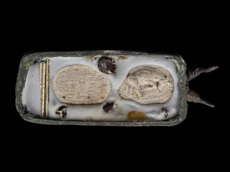 ใต้ฐานอุดปูน ฝังพระวัวธนูเนื้อผงมวลสาร 2 องค์ ครั่งพุทธา 6 เม็ด และตะกรุดเงิน 2 ดอก