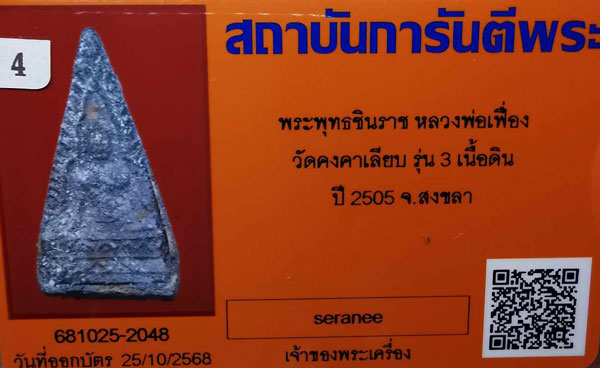 พระพุทธชินราช หลวงพ่อเฟื่อง วัดคงคาเลียบ รุ่น3 เนื้อดิน ปี2505 จ.สงขลา + บัตรG-pra สภาพเดิมค่ะ