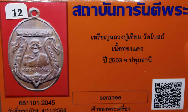 เหรียญหลวงปู่เทียน วัดโบสถ์ เนื้อทองแดง ปี2503 จ.ปทุมธานี + บัตรG-pra สภาพเดิมค่ะ สภาพตามรูปทุกประการค่ะ