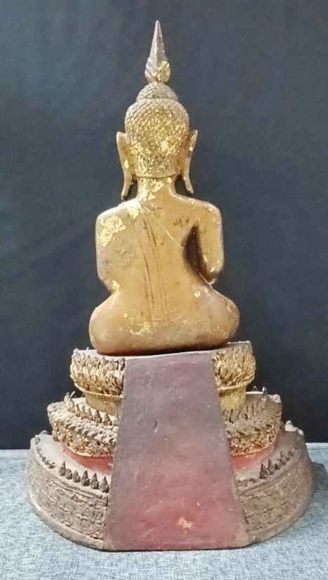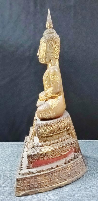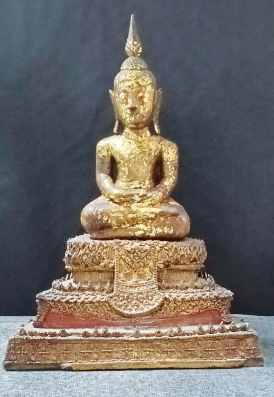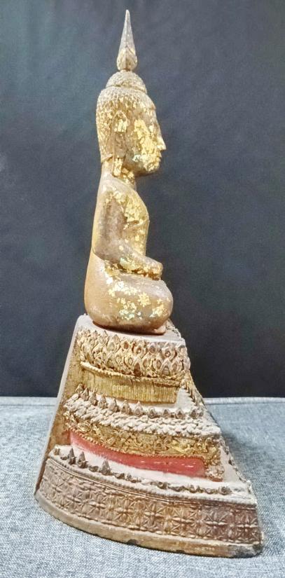 พระบูชาสมัยอยุธยา หน้าตัก 3.5 นิ้ว ไม้แกะสลัก ลงรักปิดทอง ฐานดินเหนียวประดับลวดลายแกะนูนสูงและลงรักปิดทอง