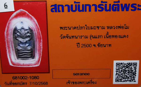 เคาะเดียว พระนาคปรกใบมะขาม หลวงพ่อโม วัดจันทนาราม รุ่นแรก เนื้อทองแดง ปี 2500 จ.ชัยนาท + บัตรG-pra สภาพเดิม |