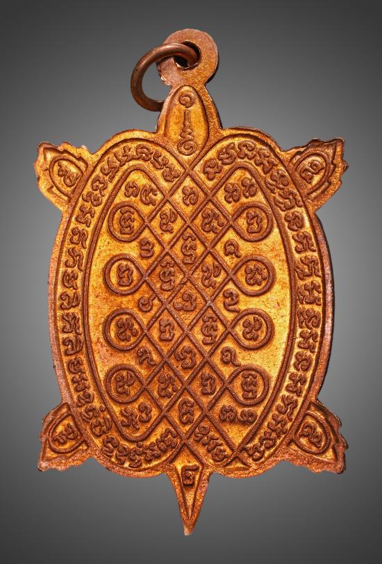 ด้านหน้าเป็นรูปพระพุทธเจ้าปางเปิดโลก ด้านหลังเป็นยันต์พญาเต่าเรือน