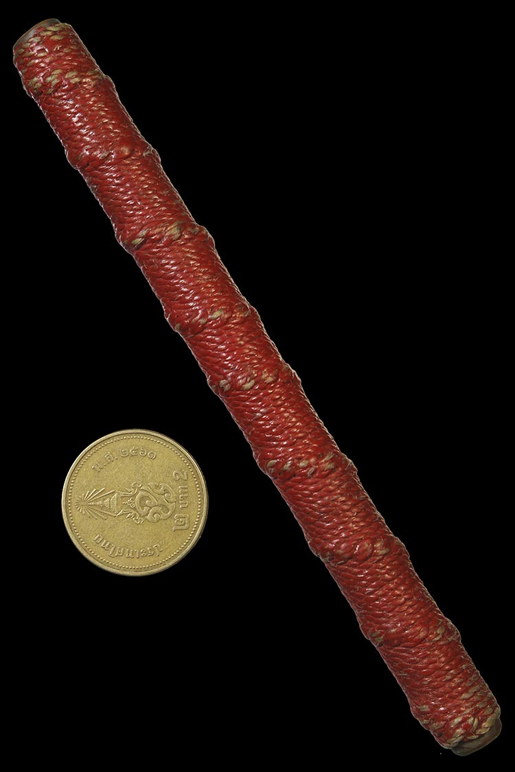 วัดใจ**เครื่องราง ตะกรุดเนื้อทองแดงถักเชือก ลงชาดแดงเก่า ยาว 4.5นิ้ว ไม่ทราบที่....ตามสภาพครับ |
