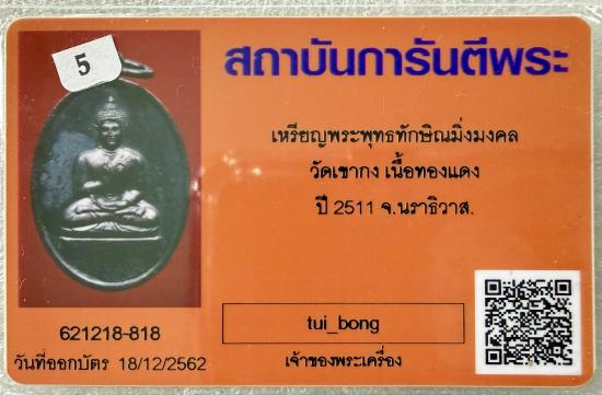เหรียญพระพุทธทักษิณมิ่งมงคล ปี 2511 วัดเขากง จ.นราธิวาส พร้อมบัตรรับรอง |