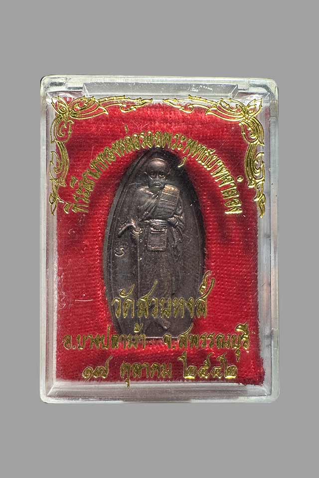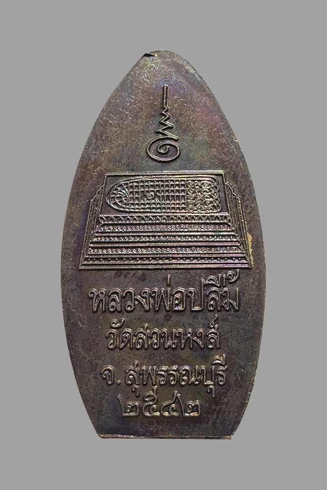 รายละเอียด เหรียญยืนถือไม้เท้าหลวงพ่อปลื้ม วัดสวนหงส์ อำเภอบางปลาม้า จังหวัดสุพรรณบุรี สร้างปี 2542