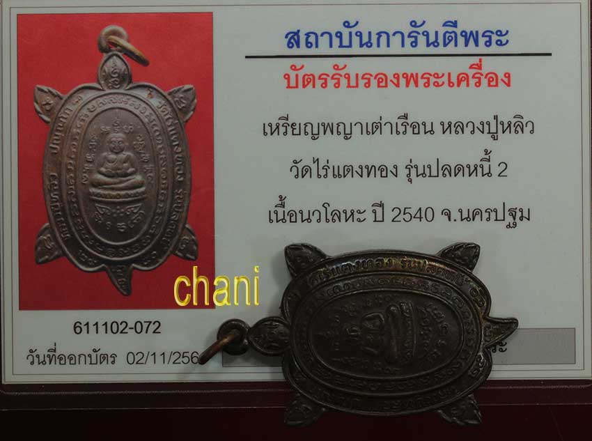 เหรียญ พญาเต่าเรือน หลวงปู่หลิว วัดไร่แตงทอง รุ่นปลดหนี้2 เนื้อนวะโลหะ 1ใน 499 องค์ ปี2540 จ.นครปฐม สภาพสวย พร้อมบัตรรับรองพระแท้จากจีพระอุ่นใจได้ ไม่ต้องลุ้นค่ะ
