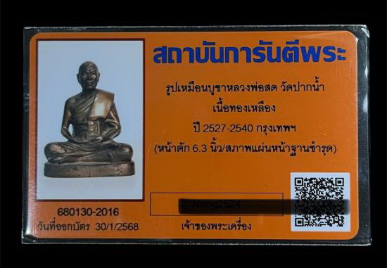 รูปเหมือนหลวงพ่อสด วัดปากน้ำ เนื้อทองเหลือง ปี 2527-2540 (หน้าตัก 6.3 นิ้ว) +บัตรรับรองครับ