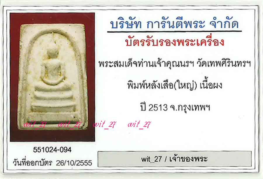 พระสมเด็จเจ้าคุณนรฯ พิมพ์หลังเสือใหญ่ ปี 2513 วัดเทพศิรินทร์ กรุงเทพฯ..พร้อมบัตรรับรอง G-Pra...