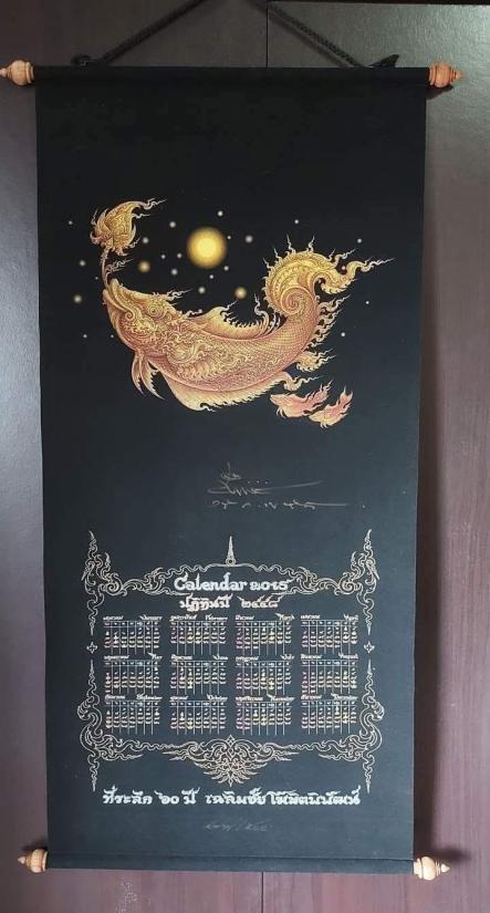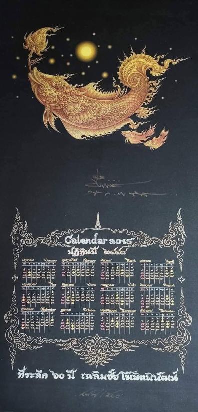 ปฏิทินที่ระลึก ครบ ๖๐ ปี ท่านอาจารย์เฉลิมชัย โฆษิตพิพัฒน์ ปี ๒๕๕๘ หมายเลข ๔๙๗/๕๐๐ +ลายเซ็นท่านอาจารย์ พร้อมกล่องเดิม ขนาดภาพ 44 * 90 ซม. ปฏิทินที่ระลึก ครบ ๖๐ ปี จัดพิมพ์แค่ 500 ผืนเท่านั้น ไม่มีพิมพ์เพิ่มแล้ว