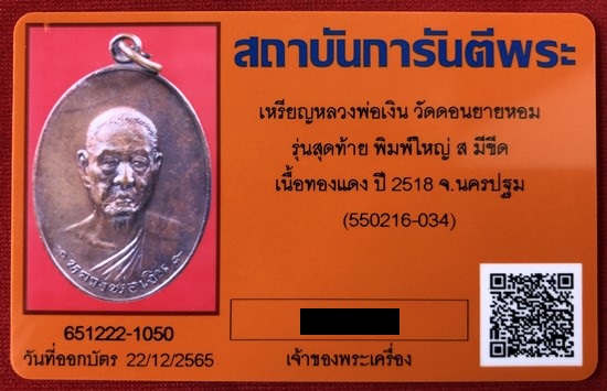 เหรียญรุ่นสุดท้าย หลวงพ่อเงิน วัดดอนยายหอม สร้างปี 2518 เนื้อทองแดง บล็อคนิยม ส.ขีด ผิวสวยเดิม พร้อมบัตรรับรอง