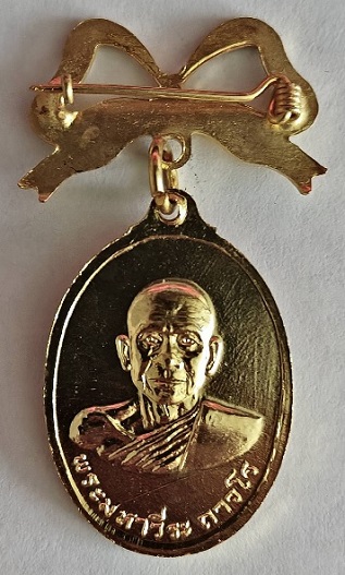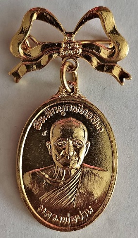 เหรียญที่ระลึกงานผูกพัทธสีมา ชุบกะไหล่ทอง หลวงพ่อปาน - หลวงพ ่อฤาษีลิงดำ วัดท่าซุง ปี2520 มีโบว์มีเข็มกลัด