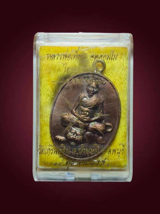 เหรียญชนะจน หลวงพ่อเพี้ยน วัดเกริ่นกฐิน จ.ลพบุรี ไตรมาส 2556 เนื้อทองแดงห่วงเชื่อม ตอกโค๊ต ตอกหมายเลข 7152 กล่องเดิม สภาพสวย