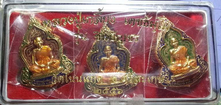 "วัดใจ" ชุด 3องค์ เหรียญใบเสมา ชินบัญชร เนื้อทองระฆังลงยา หลวงปู่เกลี้ยง วัดโนนแกด สภาพสวยพร้อมกล่องเดิม หมายเลข 769 ครับ |