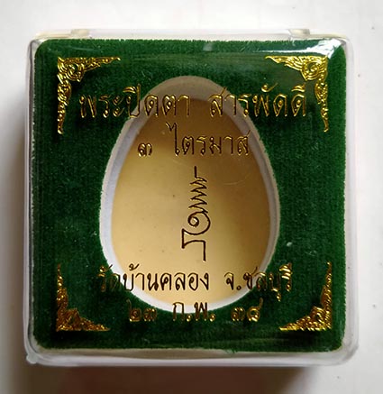 พระปิดตาสารพัดดี 3 ไตรมาส หลวงพ่อคูณ ปริสุทโธ ออกวัดบ้านคลอง ปี 2538 เนื้อผงธูป ฝังตะกรุด ติดจีวร ไม่มีปรก เคาะเดียว ซองเดิมและกล่อง |