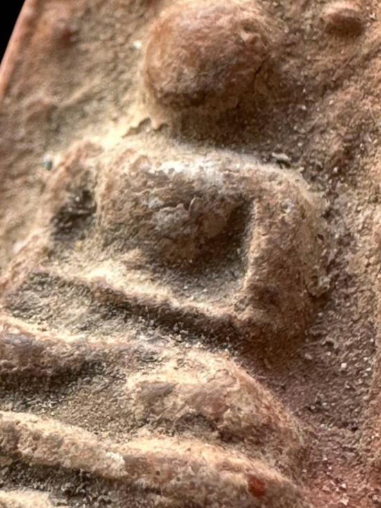 เนื้อดินโบราณโทนสีน้ำตาลอมแดง มีคราบแห้งและผงกรุเกาะทั่วองค์