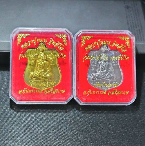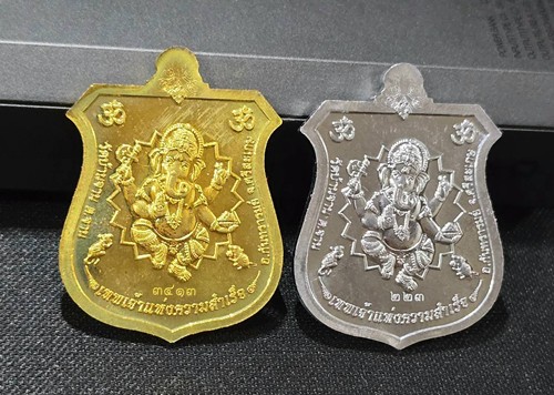 2 องค์ . สภาพสวย . เท่าไหร่เท่านั้น ... เหรียญมหาสำเร็จ หลวงปู่หมุน หลังพระพิฆเนศ เนื้อตะกั่ว+เนื้อทองเหลือง วัดบ้านจาน ปี 60 + กล่องเดิม |