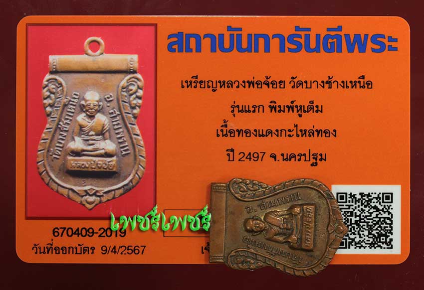 เหรียญ หลวงพ่อจ้อย วัดบางช้างเหนือ รุ่นแรก พิมพ์หูเต็ม เนื้อทองแดงกะไหล่ทอง ปี2497 จ.นครปฐม สภาพสวยคมชัด พร้อมบัตรรับรองพระแท้จากการันตีพระสบายใจได้พระแท้แน่นอน ค่ะ