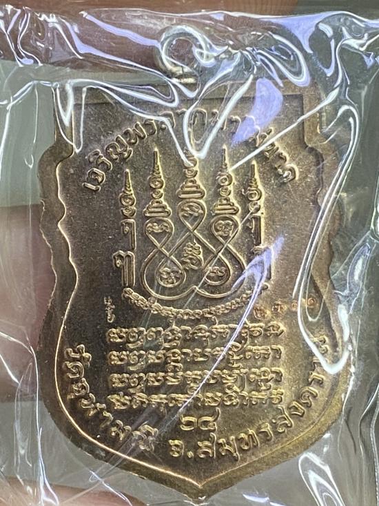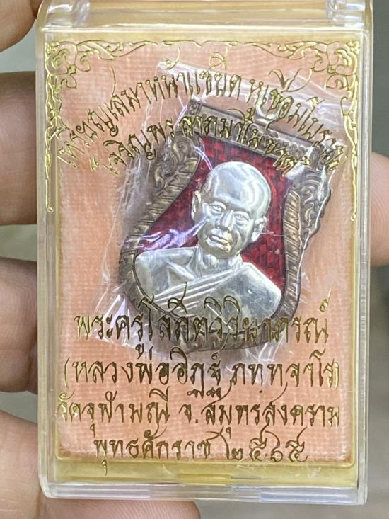 เหรียญเสมาหน้าแซยิดหูเชื่อมโบราณ หลวงพ่ออิฎฐ์ วัดจุฬามณี จ.ส มุทรสงคราม พ.ศ.2565 เนื้อนวะโลหะเต็มสูตรลงยาแดงหน้าเงินลงยา เลข 2390 กล่อง