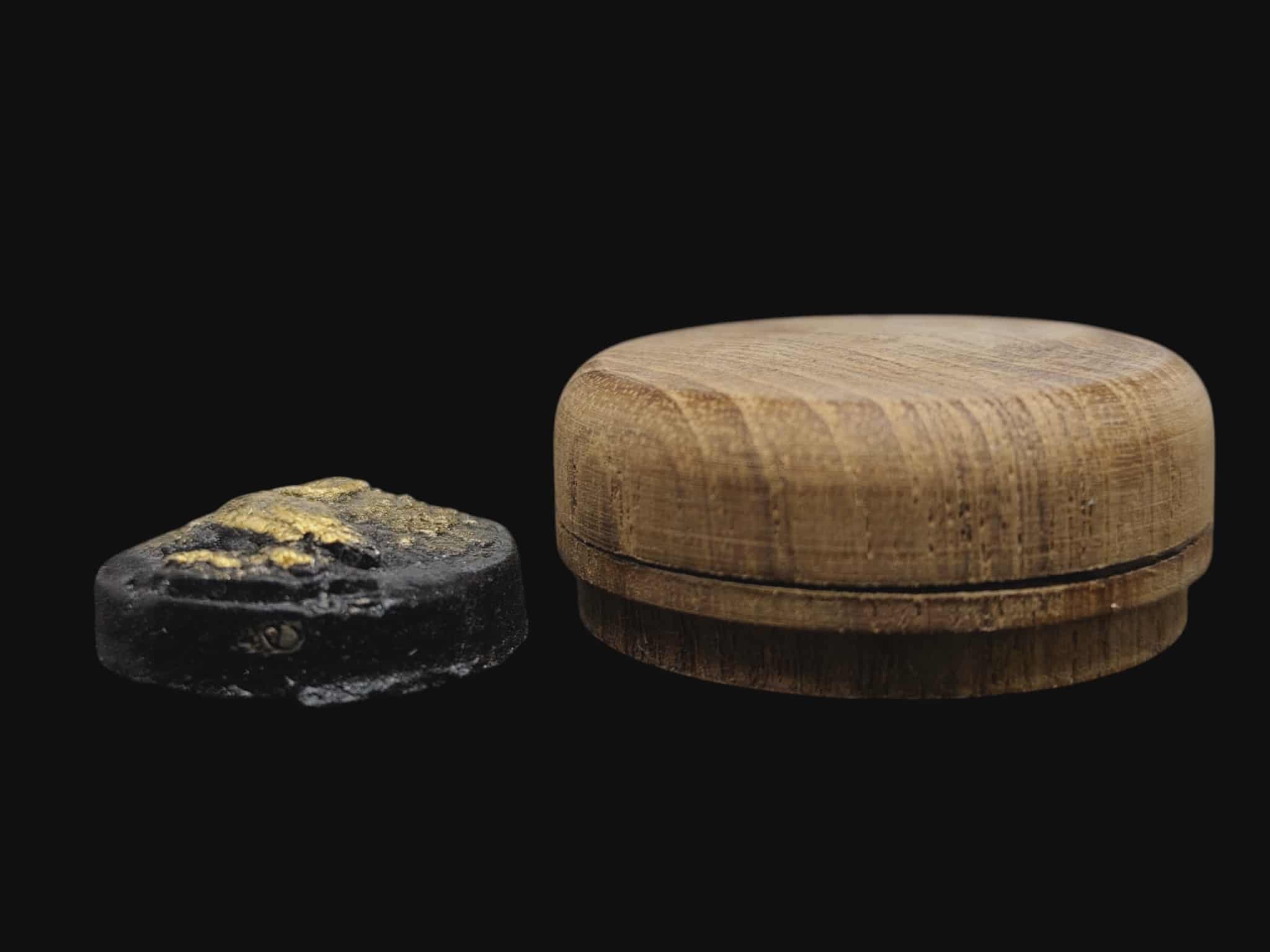 พญายูงคำ รุ่นแรก เนื้อดำปัดทอง และ ตลับไม้สีผึ้งเนื้อหอม รังผึ้งร้าง ขวางเดือนขวางตะวัน รุ่นแรก ฝังอิ่น ตะกรุด ในเมตตาบารมี เจ้าปู่จั่นต่า กาวิสาละ พญานกยูง ขนาดเท่าเหรียญสิบบาท