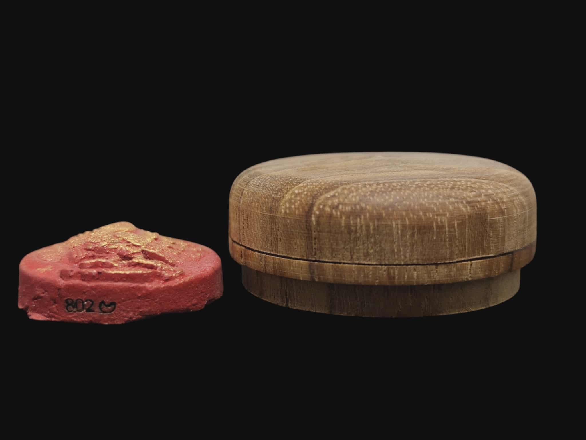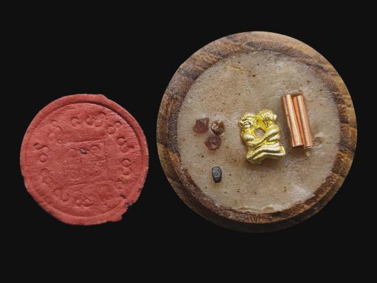 เคาะเดียวแดง พญายูงคำ รุ่นแรก เนื้อแดงปัดทอง และ ตลับไม้สีผึ้งเนื้อหอม รังผึ้งร้าง ขวางเดือนขวางตะวัน รุ่นแรก ฝังอิ่น ตะกรุด ในเมตตาบารมี เจ้าปู่จั่นต่า กาวิสาละ ครูบากฤษดา เมตตาเษก |