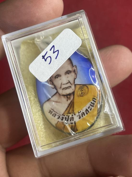 หลวงปู่ดู่ วัดสะแก ฉากฟ้า ซีเปีย พิมพ์รูปไข่ หลังยันต์ เนื้อตะกั่ว ปี 53 |