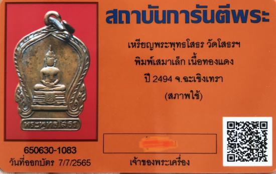 เหรียญหลวงพ่อโสธร พิมพ์เสมาเล็ก เนื้อทองแดง ปี 2494 พร้อมบัตรการันตี ครับ