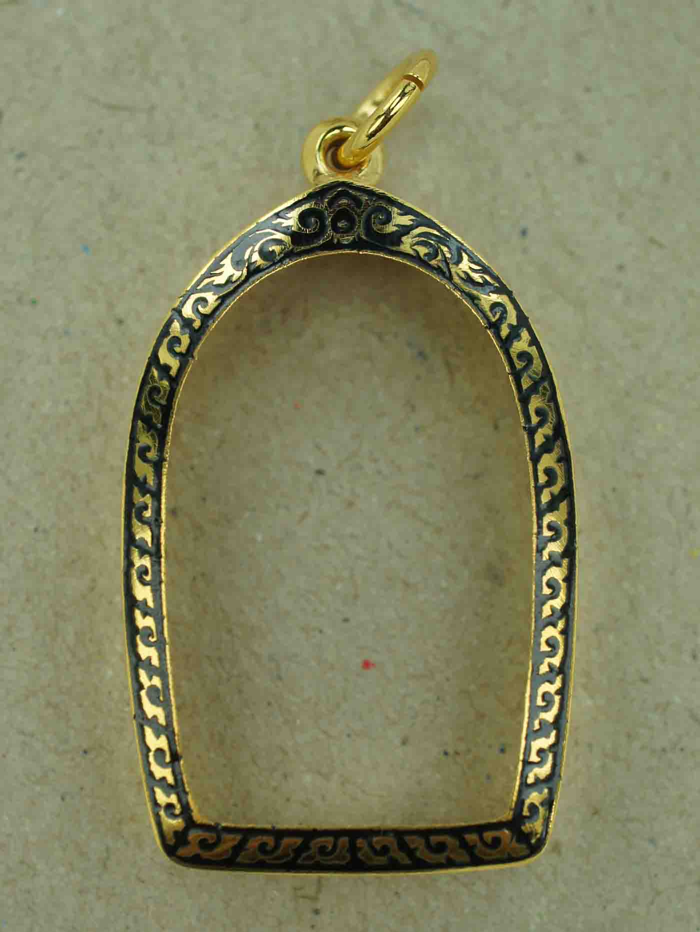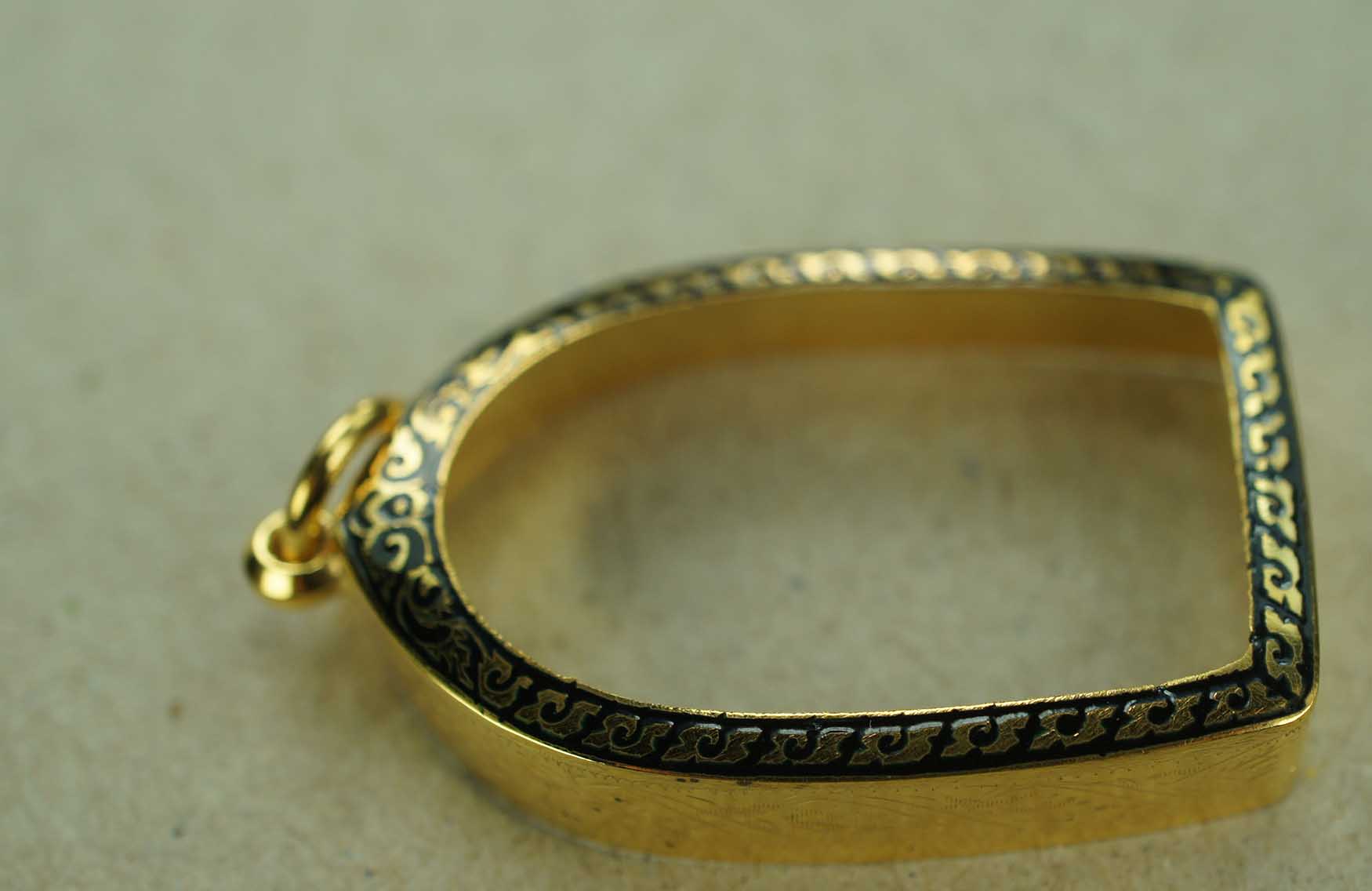 กรอบทอง ลงยาดำ ข้างแกะลาย (ตรง Size ) ใส่ ท้าวเวสสุวรรณ หลวงพ่อทองสุข หรือ หนุมาน หลวงปู่ทิม วัดละหารไร่ ขนาดวัดจากขอบด้านใน สูง 3.2 Cm. กว้างฐานล่าง 1.7 Cm. งานขึ้นมือ น้ำหนัก 3.05 กรัม เปอร์เซ็นต์ทอ