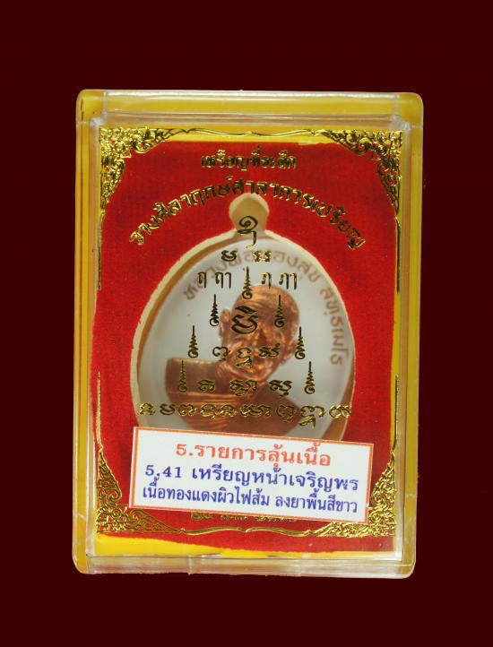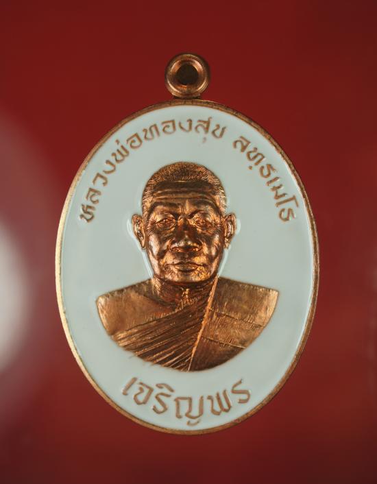 เหรียญเจริญพรเลี่อนสมณศักดิ์ เนื้อทองแดงผิวไฟส้ม ลงยาพื้นขาว หน้าเจริญพร สร้างน้อย 760 เหรียญ หมายเลข 266 หลวงพ่อทองสุข วัดหนองฆ้อ ระยอง พร้อมกล่องเดิมจากวัด ( ขนาดความสูง 4.3 ซม. กว้าง 3 ซม. )