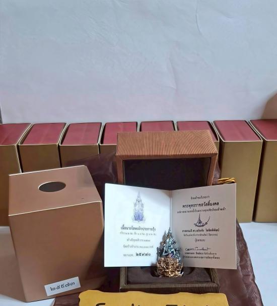 กราบขออนุญาตท่านอ.เฉลิมชัย โฆษิตพิพัฒน์ นำเสนอ พระพุทธราชสวัสดิ์มงคล เนื้อนวะโลหะ ผิวรุ้ง หมายเลข ๒๕๙๗๓ ขนาดกว้าง ๒.๒ ซม. ลึก ๑.๙ ซม. สูง ๔.๒ ซม อุปกรณ์ครบ