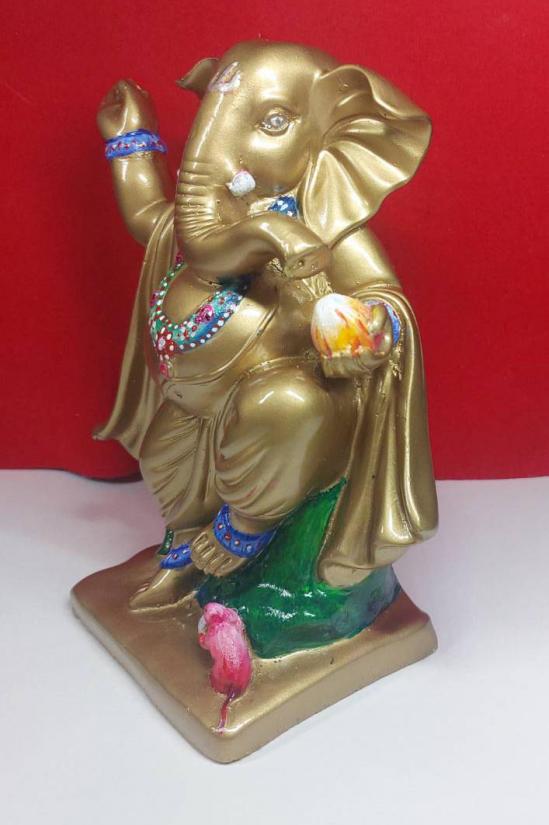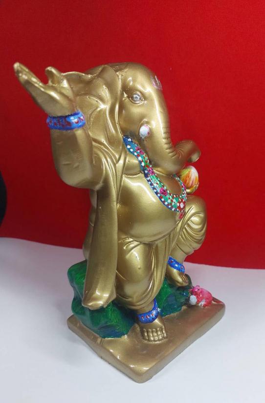 พระคเณศวรปางลีลาร่ายรำ ขนาดสูง 7 นิ้ว ถือขนมโมทกะเพื่อประทานความร่ำรวย เนื้อเรซิ่นเพ็นสี