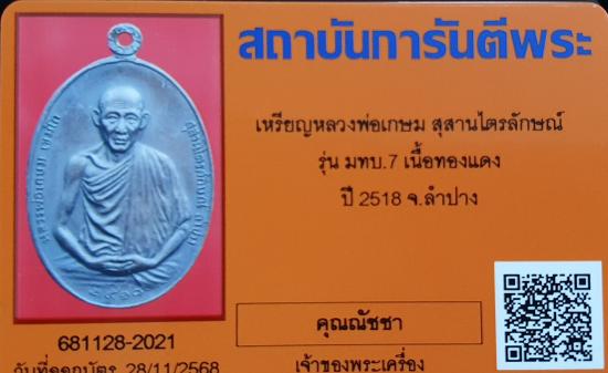เหรียญมทบ.7 เนื้อทองแดง หลวงพ่อเกษมเขมโก มาพร้อมบัตรรับรองครับ
