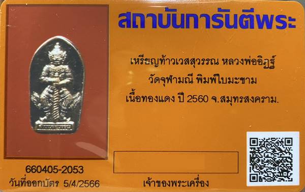 เหรียญท้าวเวสสุวรรณหลวงพ่ออิฏฐ์ วัดจุฬามณี พิมพ์ใบมะขาม เนื้อทองแดง ปี 2560 เลี่ยมกรอบพร้อมใช้ มีบัตรรับรอง จ.สมุทรสงคราม