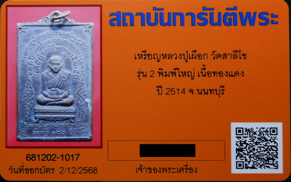 *สุดยอดประสบการณ์ * เหรียญหลวงปู่เผือก วัดสาลีโข (พิธี 4 มหาจักร) เนื้อทองแดงรมดำ รุ่น2 ปี2514 พิมพ์ใหญ่ + บัตรรับรอง G-PRA