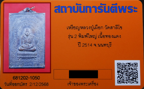 เหรียญหลวงปู่เผือก วัดสาลีโข (พิธี 4 มหาจักร) เนื้อทองแดงรมดำ รุ่น2 ปี2514 พิมพ์ใหญ่ + บัตรรับรอง G-PRA