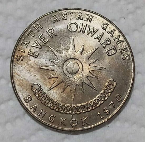 เหรียญ 1 บาท เอเชี่ยนเกมส์ ครั้งที่ 6 ในหลวงคู่ราชินี พ.ศ.2513 ในสมัยรัชกาลที่ 9 สภาพไม่ผ่านใช้แกะแบ่งจากถุง จำนวน 1 เหรียญ ครับ ((ปี้มพลาดตามรูปครับที่วงสีเหลืองไว้ครับ พอเจอน้อยครับ))