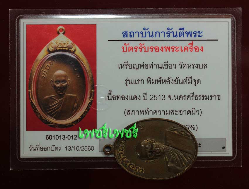เหรียญ พ่อท่านเขียว วัดหรงบล รุ่นแรก พิมพ์หลังยันต์มีจุด เลข๒บี้ เลข๓แบน นิยมสุด เนื้อทองแดง ปี2513 จ.นครศรีธรรมราช สภาพสวยคมชัด ยังมีกะไหล่ทองให้เห็น พร้อมบัตรรับรองพระแท้จากการันตีพระสบายใจได้พระแท้ |