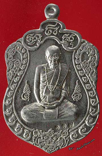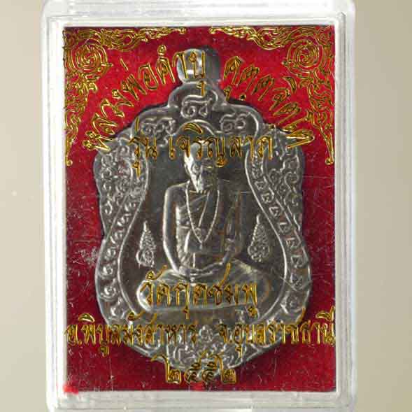 เหรียญเสมา ลป.คำบุ รุ่น เจริญลาภ เนื้อตะกั่วผสมตะกั่วขอมโบราญ หมายเลข ๑๑๗ ออกวัดกุดชมภู ปี 2552 |