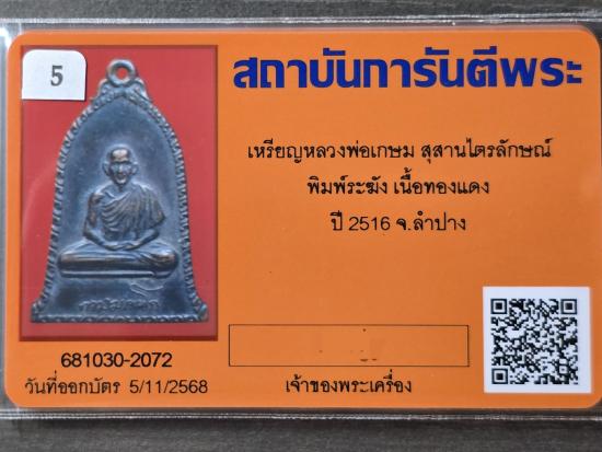 เหรียญระฆัง หลวงพ่อเกษม เขมโก พร้อมบัตรรับรอง