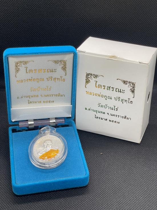 เหรียญหลวงพ่อคูณ ปริสุทโธ วัดบ้านไร่ รุ่นไตรสรณะ จัดสร้างปี ๒๕๕๗ เหรียญจากชุดกรรมการอุปถัมภ์ เนื้อเงิน ลงยาจีวรเหลือง หมายเลข ๑๔๙