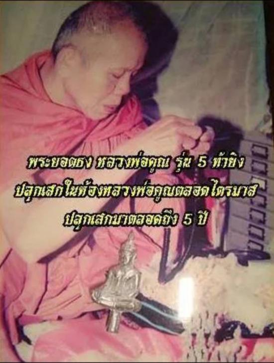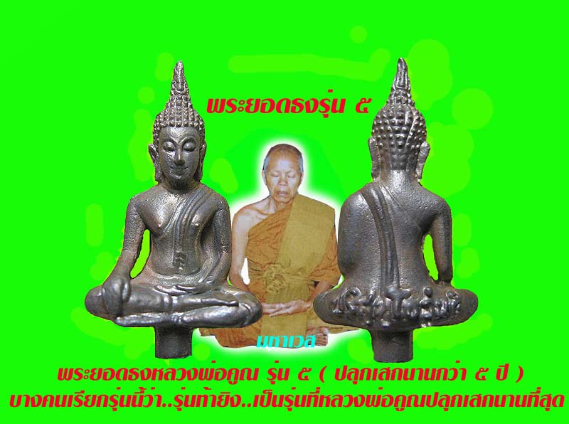 ระ ยอดธงหลวงพ่อคูณ รุ่น 5 เนื้อนวโลหะ ครบรอบ 75 ปี จัดสร้างปี พ.ศ.2541..ใต้ฐานพระจะตอกโค๊ด 2 ตัว คือโค๊ดตัวนะ กับ โค๊ดคำว่าคูณ..พร้อมกล่องเดิมๆ จากวัด.((( ลูกศิษย์ต่างเรียก พระยอดธง รุ่น 5 หรือ รุ่นท้ายิง ))).สร้างด้วยกันสองเนื้อคือ เนื้อนวะ กับเนื้อตะกั่ว..มีทั้งแบบตอกโค๊ด และไม่ตอกโค๊ด..เป็นรุ่นที่หลวงพ่อคูณปลุกเสกมากกว่า 5 ปี ถือว่าเป็นรุ่นที่หลวงพ่อคูณปลุกเสกยาวนานที่สุด พุทธคุณดีทุกด้าน จะเป็น ทางด้าน มหาอุตห์ คงกระพัน แคล้วคลาด เมตตามหานิยม หรือโชคลาภ เพราะว่าเป็นรุ่นที่หลวงพ่อคูณตั้งใจให้สร้าง โดยที่หลวงพ่อเรียกช่างทำพระเข้าพบส่วนตัวให้สร้างพระยอดธง ขึ้นมาให้ท่าน และให้ช่างทำพระสาบานว่าจะไม่บอกให้ใครรู้จนกว่าจะสร้างพระเสร็จและทำลาย บล็อกทิ้ง.. หลวงพ่อคูณท่านเก็บพระยอดธงรุ่นนี้ไว้ในลังไม้ในกุฏิของท่าน แล้วท่านก็ปลุกเสกทุกวันเรื่อยมา โดยที่ท่านจะดูแลพระรุ่นนี้อย่างดีโดยเก็บรักษากุญแจลังไม้เองไว้กับประ คตเอวของท่าน พระยอดธงรุ่นนี้มีประสบการณ์มาแล้วมากมาย เป็นที่กล่าวขานของกลุ่มลูกศิษย์ และที่สำคัญรุ่นนี้ที่วัดไม่มีวางจำหน่าย..ใครอยากได้ต้องเข้าหาหลวงพ่อโดย ตรง และพระยอดธงรุ่นนี้ที่วัดไม่มีเหลือแล้ว..เหตุผลที่เรียกพระยอดธงรุ่นนี้ ว่า "รุ่นท้ายิง" คือว่าหลวงพ่อคูณได้มอบพระยอดธงรุ่นนี้ให้กับนายตำรวจท่านหนึ่ง แล้วบอกว่าให้มึงลองเอาไปยิงดู...