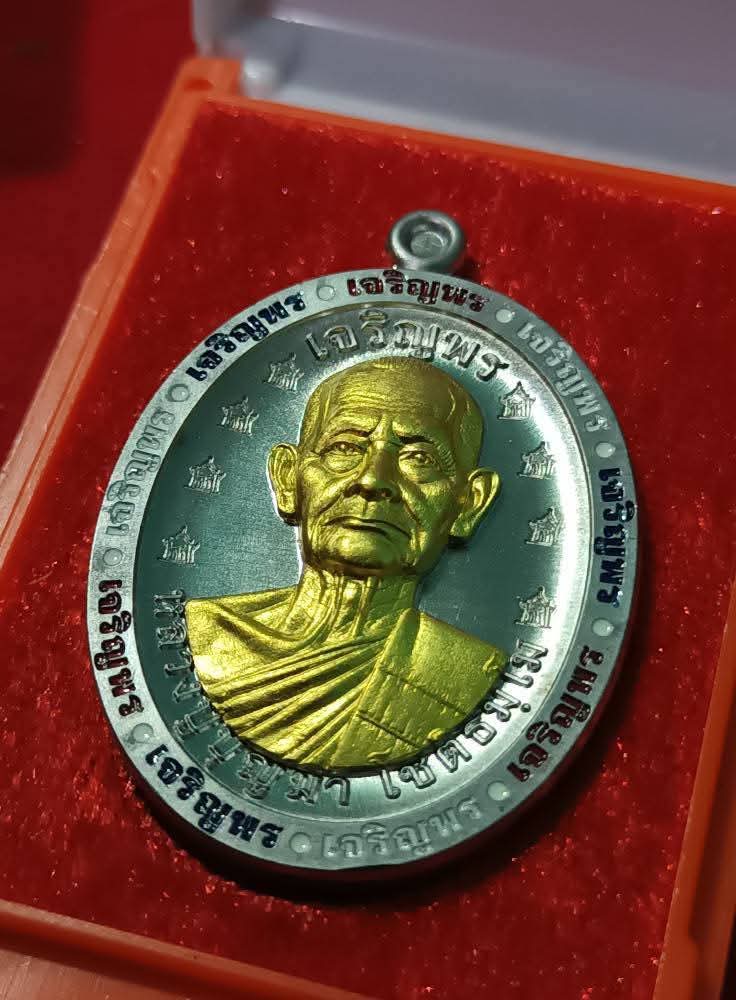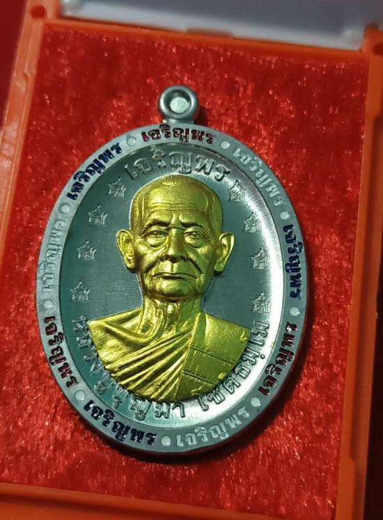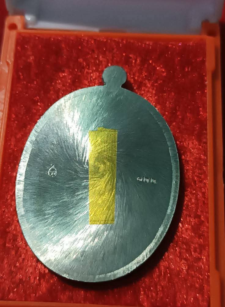 เหรียญเจริญพร7รอบ หลวงปู่บุญมา ตะกั่วหลังเรียบ หน้ากากทองทิพย์ ฝังตะกรุด1ดอก No.122