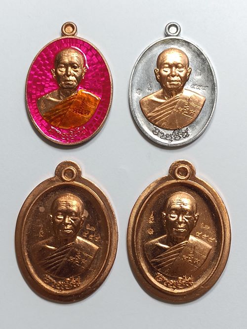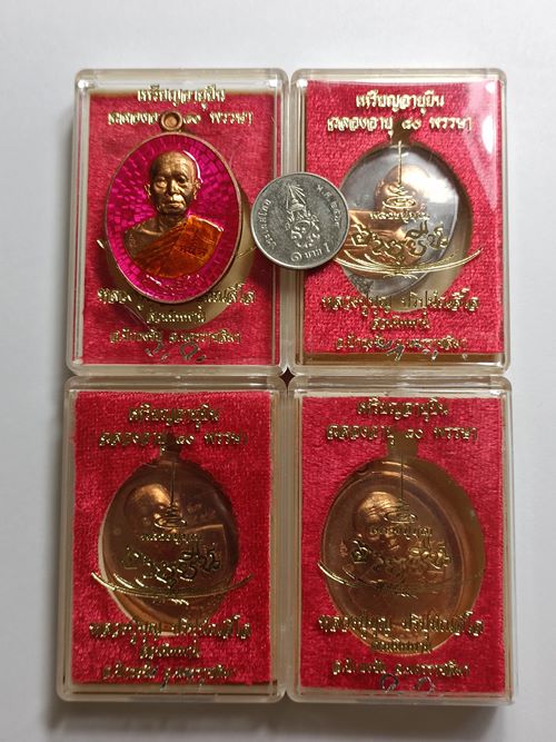 " วัดใจ เคาะเดียวแดง " เหรียญอายุยืน ฉลองอายุ 80 พรรษา หลวงปู่บุญ ปริปุนณสีโล วัดปอแดง (สวนนิพพาน) จ.นครราชสีมา ปี 2558 จำนวน 4 เหรียญ (ชุดของขวัญ หมายเลข 454 เนื้อทองแดงผิวไฟลงยาสีชมพู,เนื้อชินตะกั่วหน้ากากทองแดง,เนื้อทองแดงผิวไฟไม่ตัดปีกหลังเรียบ,เนื้อทองแดงผิวไฟไม่ตัดปีก)